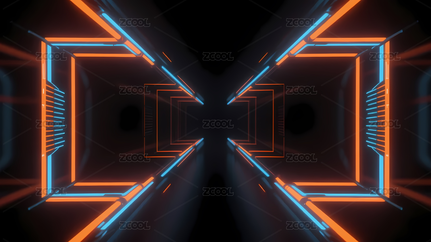 蓝橙霓虹方形未来隧道