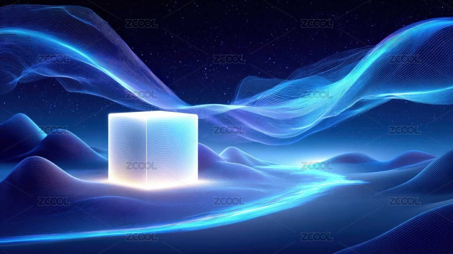 蓝色发光立方体在波浪形地面上