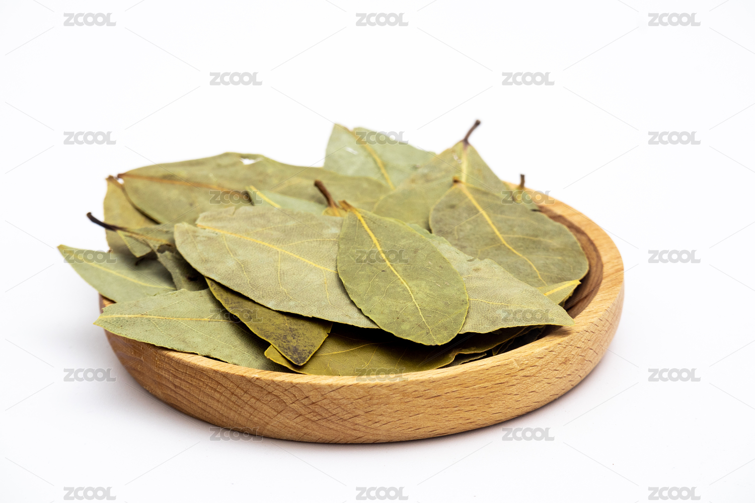 白色背景中木盘子里装着晾晒干的香叶叶子