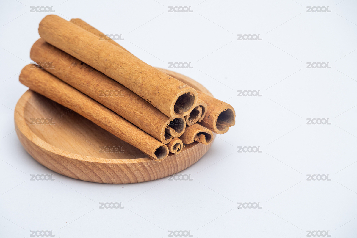 白色背景中木盘子里装着晾晒干的肉桂桂皮