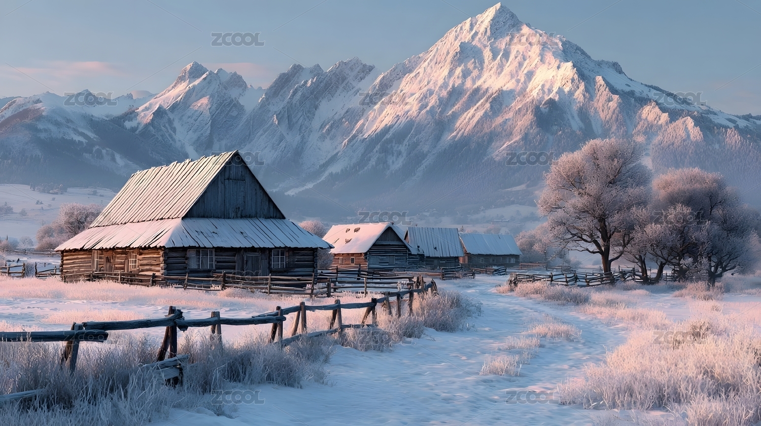 雪景,房屋,树木,山脉,阳光,自然,雪山,木屋,雪地,冬天