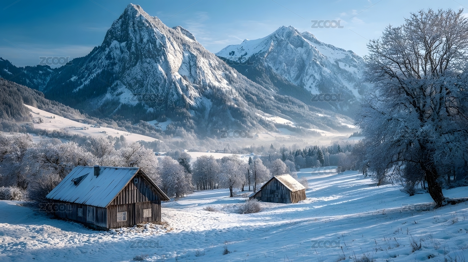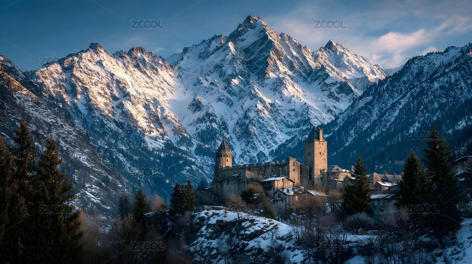 雪景,教堂,尖顶,房屋,树木,道路,积雪,山脉,蓝天,阳光