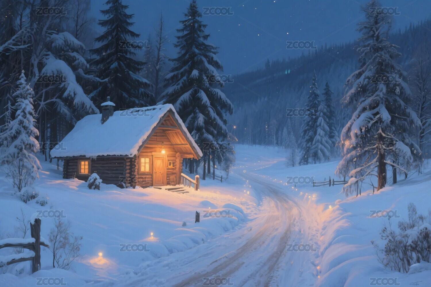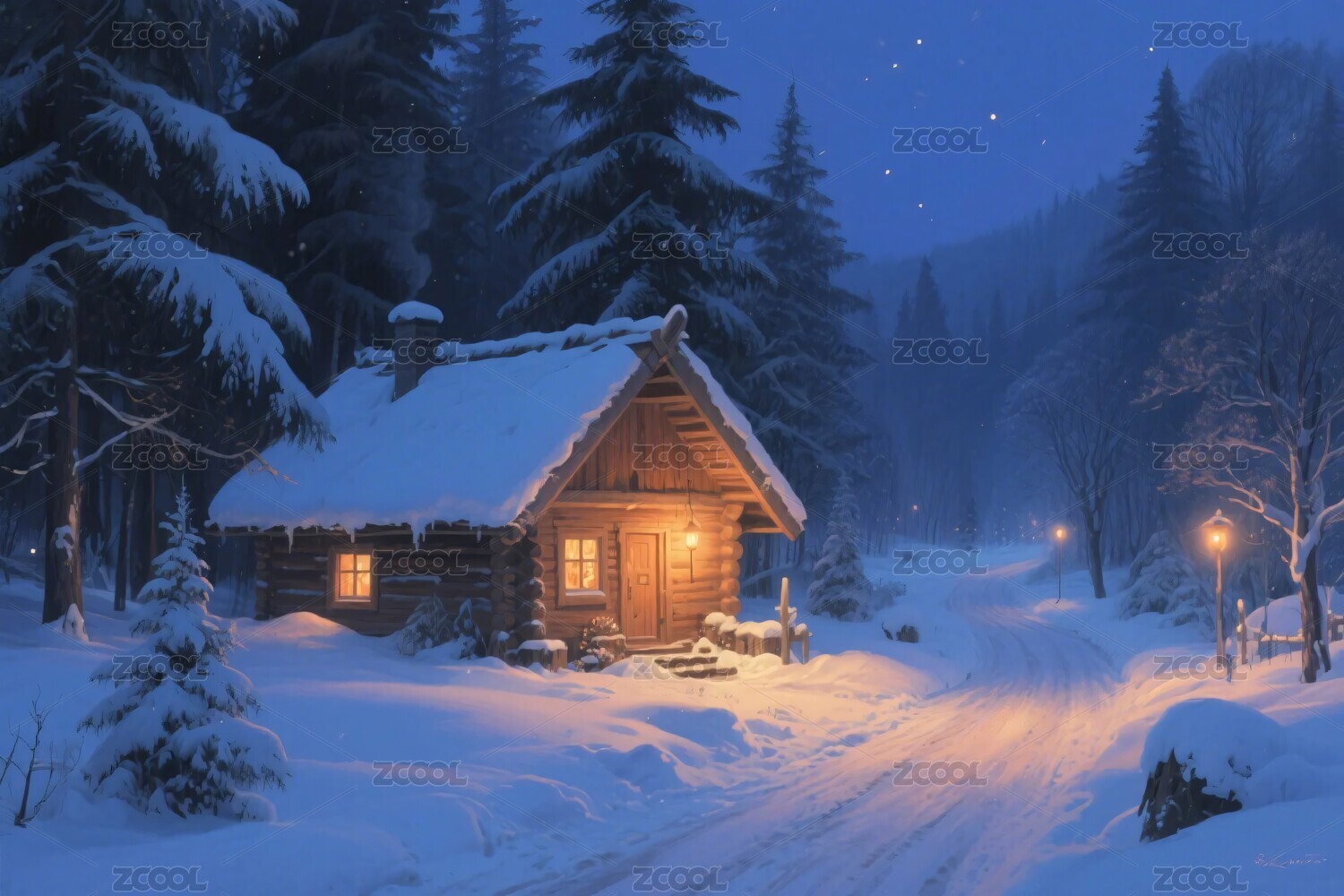 梦幻冬日大雪覆盖的村庄温暖的木屋灯光