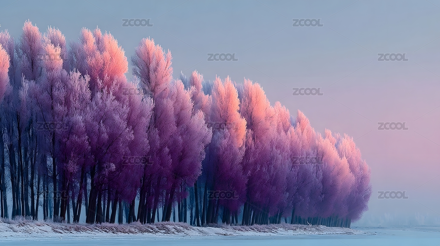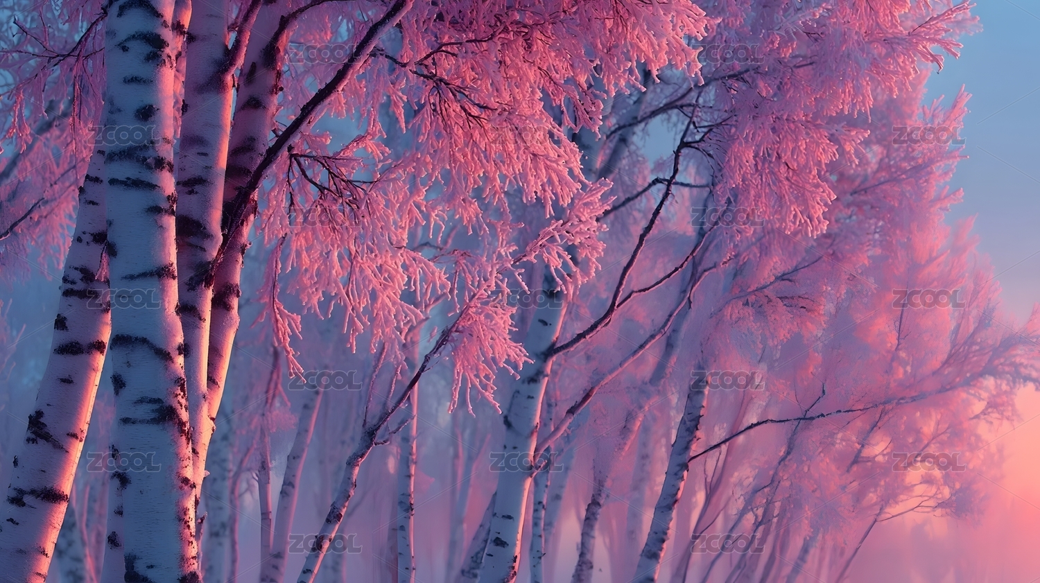 粉红霜冻白桦林