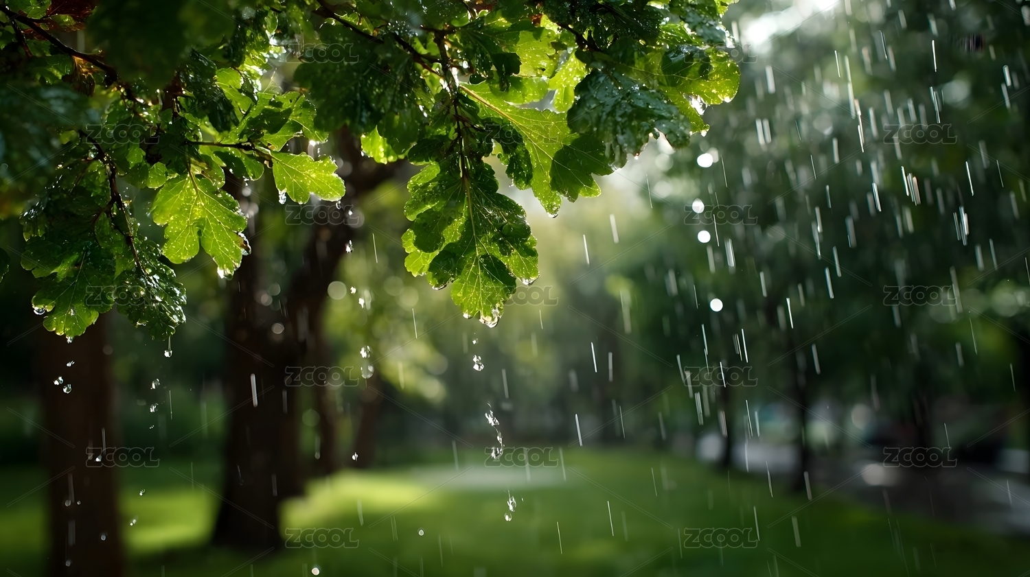 大雨中森林绿叶沾满水滴雨水雨滴植物新生
