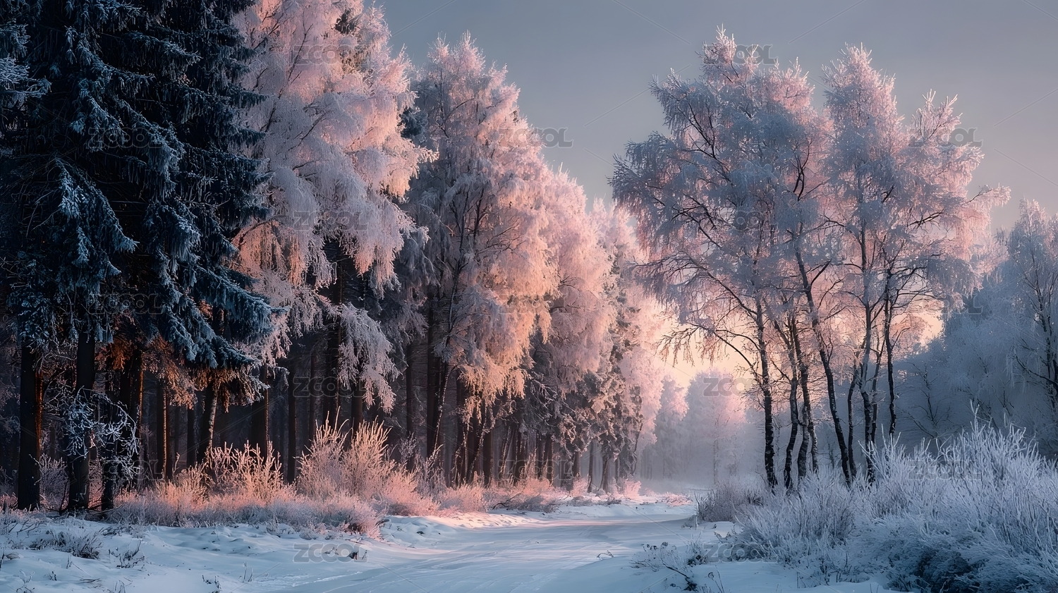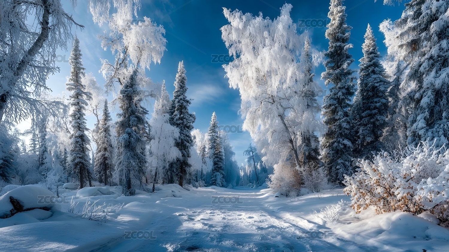 冬日白雪覆盖的林间乡村原野风景壁纸