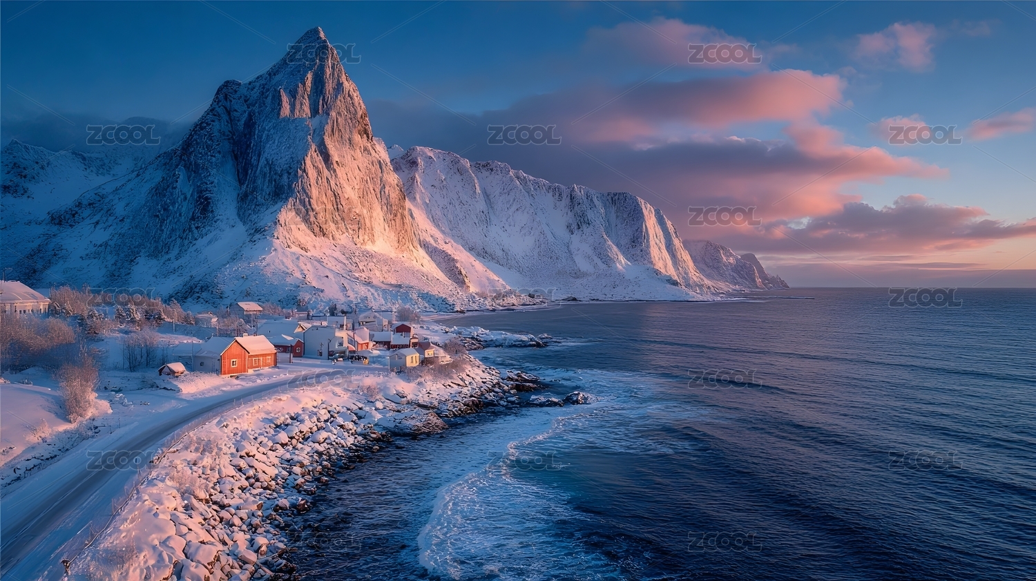 雪域海岸与山峰村庄