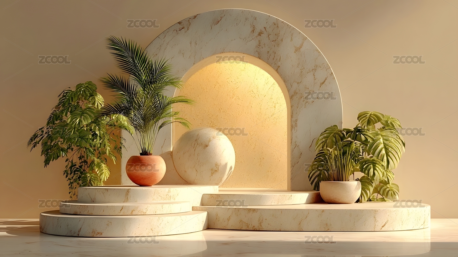拱门与棕榈植物的极简空间