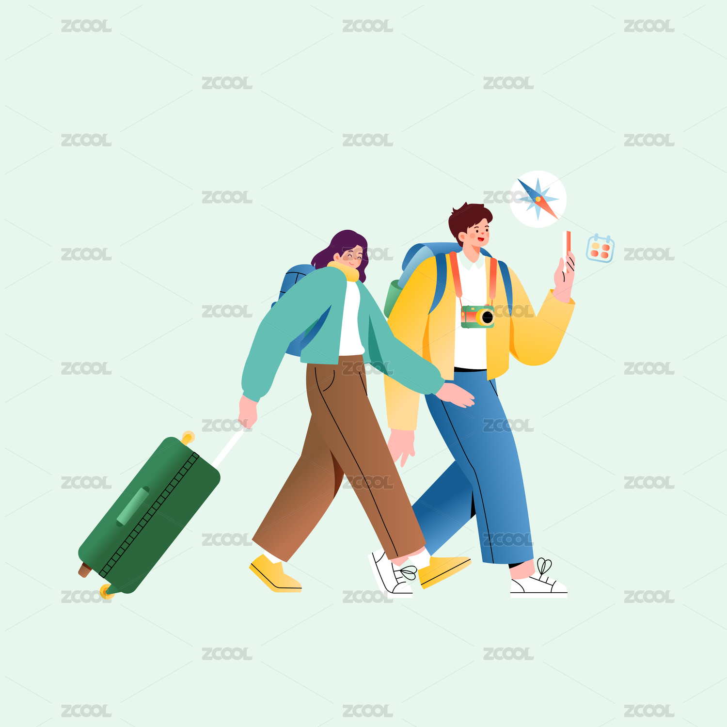 两人拖着行李快乐出行