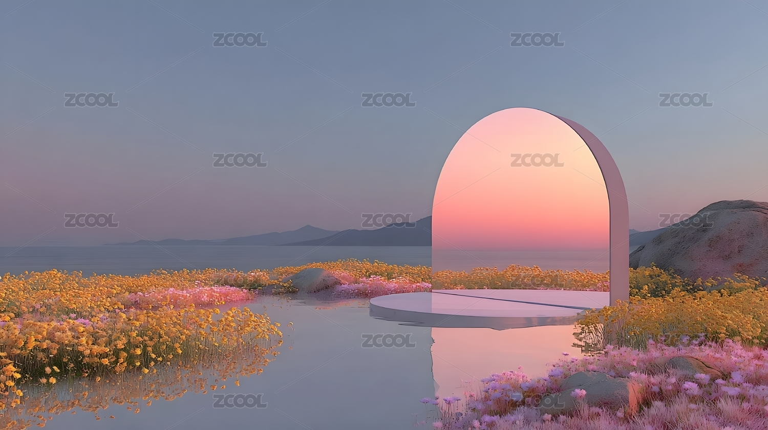 梦幻粉色花海与圆环倒影