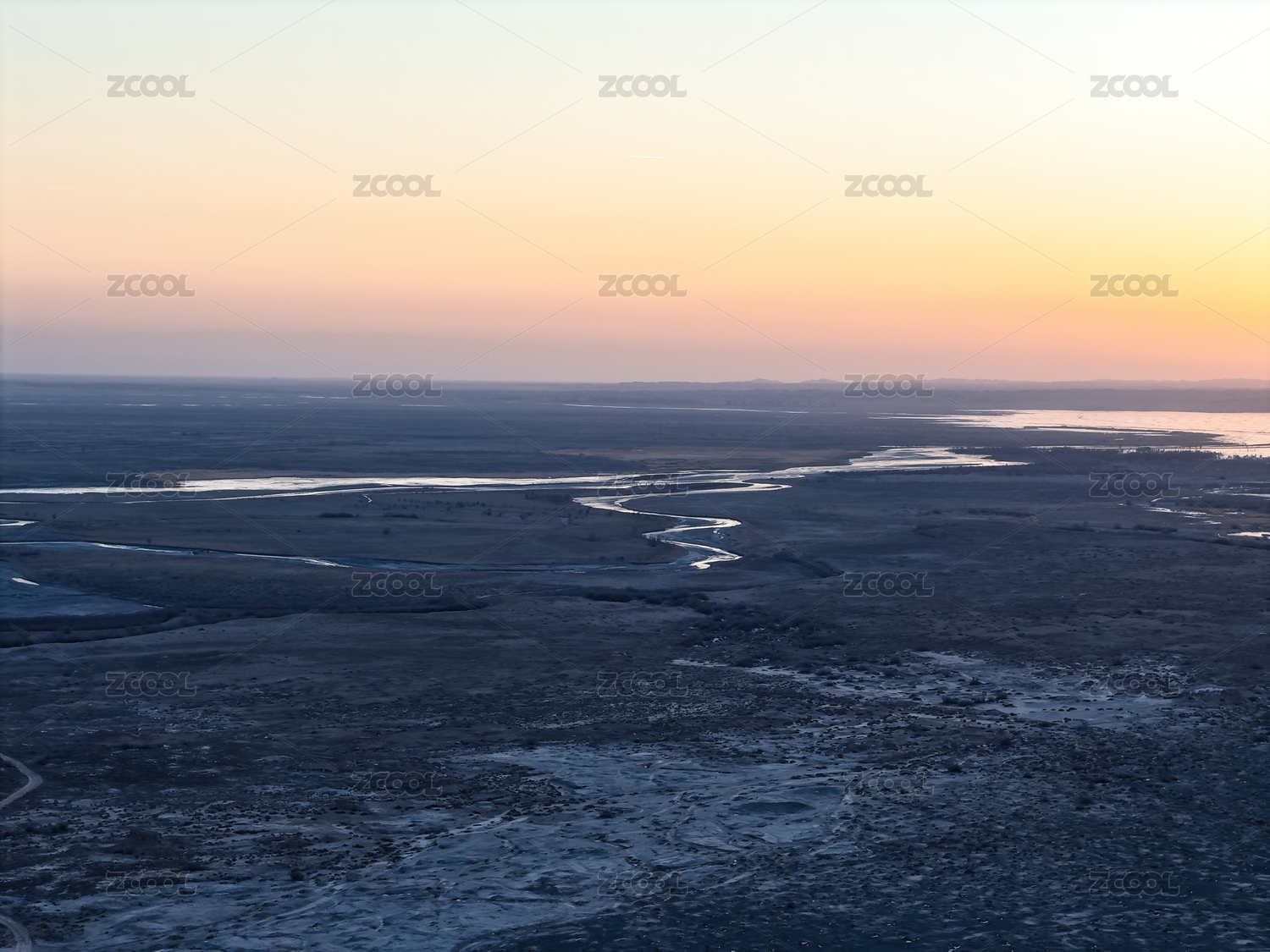 中国西北阿拉善沙漠地区盐湖荒原黄昏景观