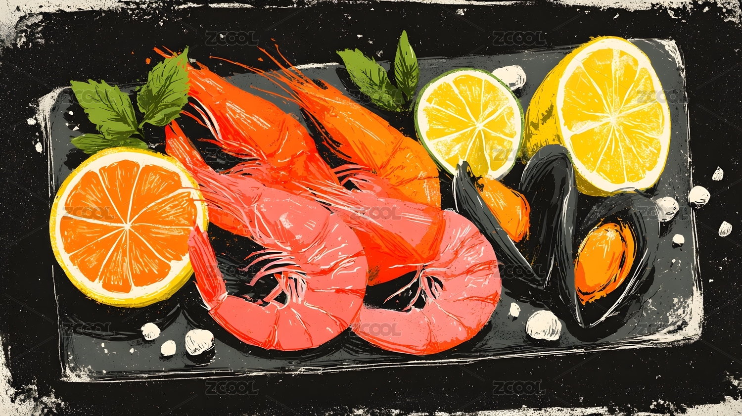 鲜虾柠檬拼盘美食特写 黑板风格艺术