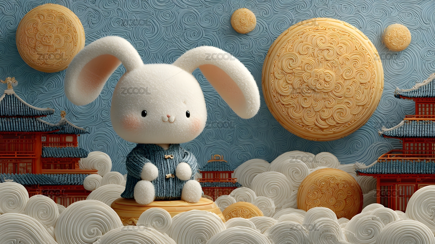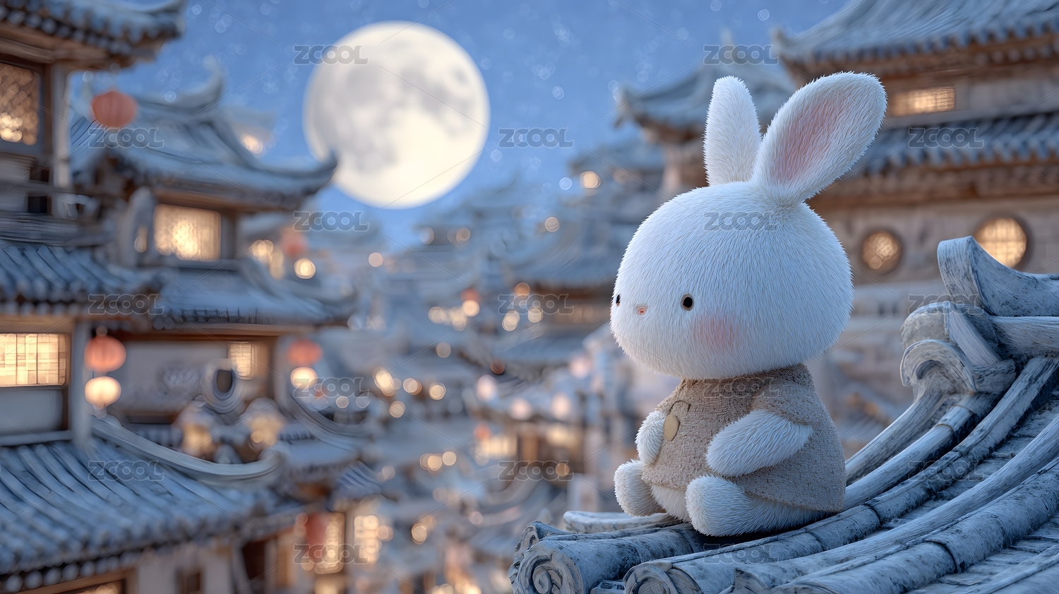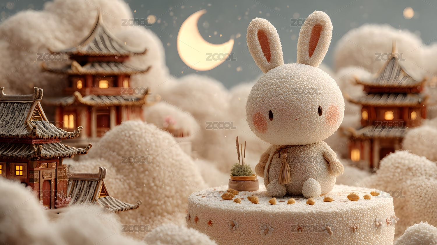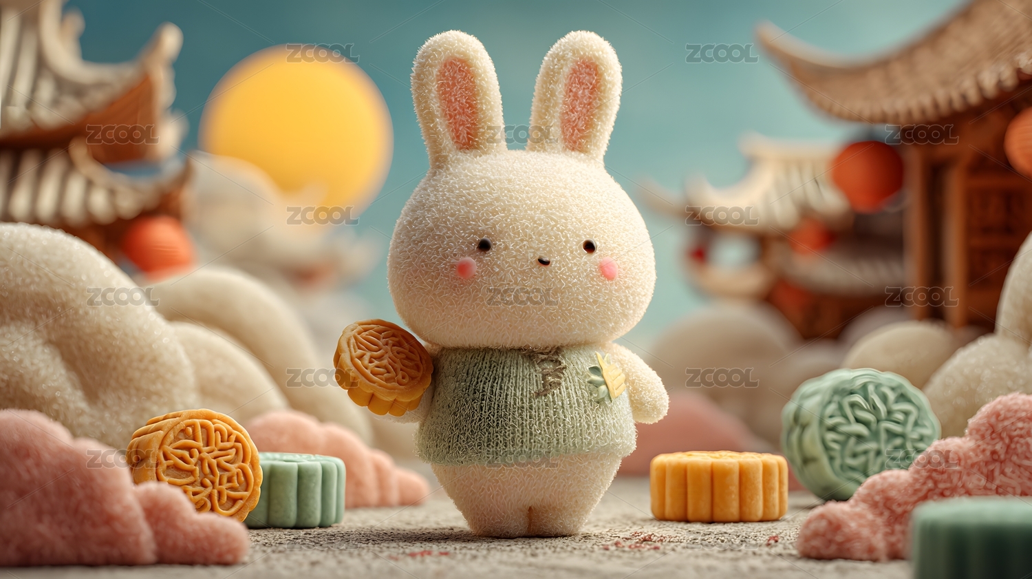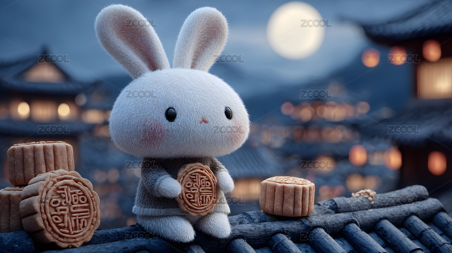 可爱玉兔赏月吃月饼 中秋节日喜庆场景
