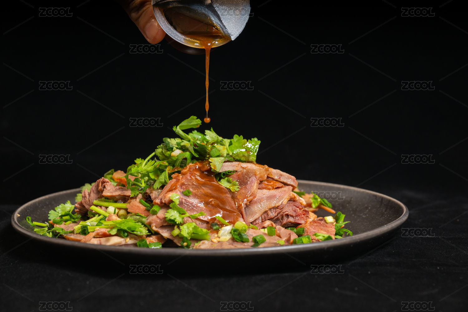 牛肉,拌菜,香菜,葱花,酱汁,美食,盘子,黑色,背景,食材
