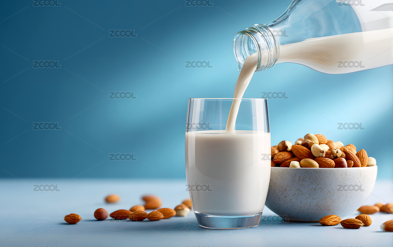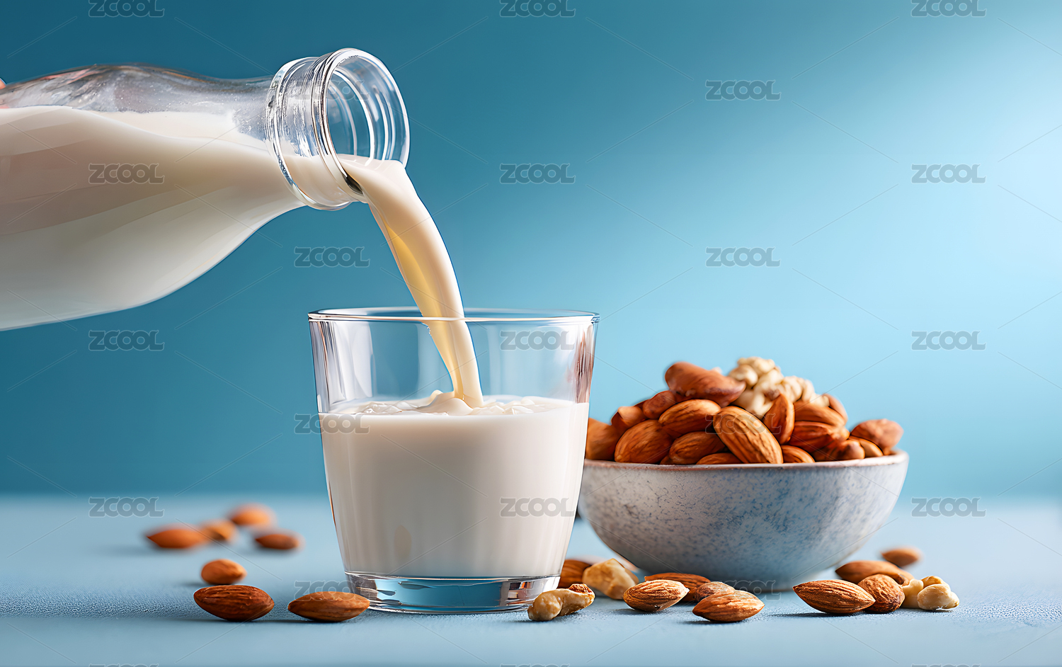 杏仁奶与杏仁果摆放 静物特写 蓝色背景
