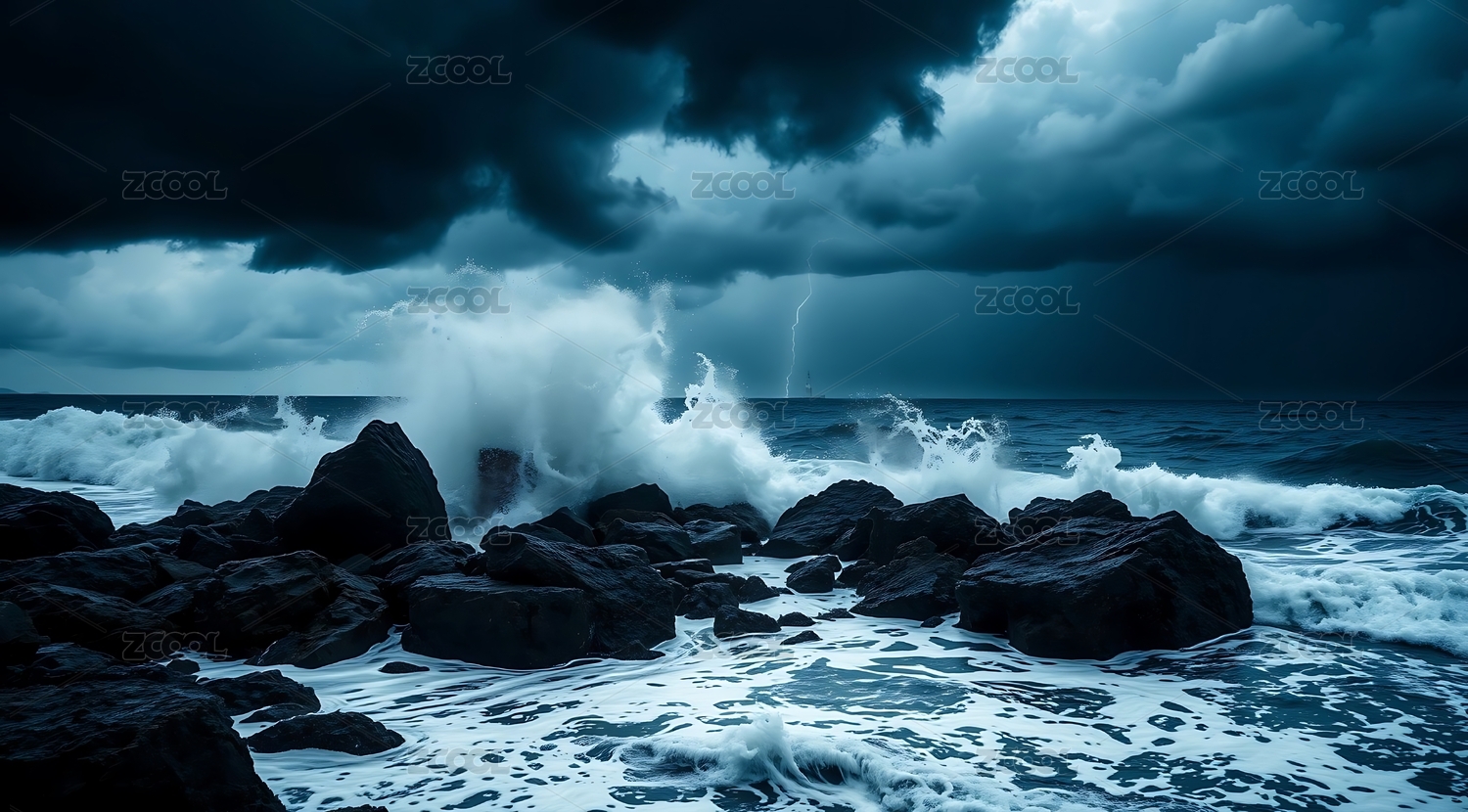 风暴海浪岩石闪电