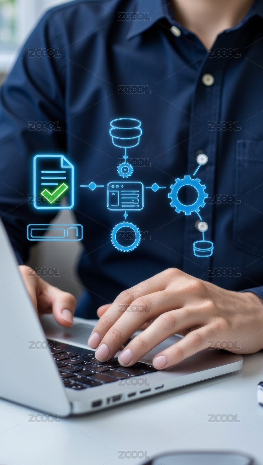 双手操作笔记本电脑屏幕上显示图标和图表