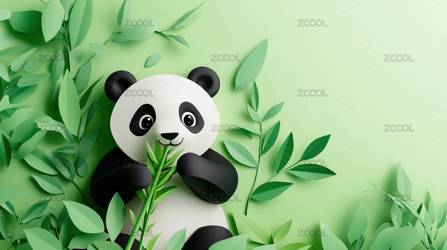 3D剪纸风格吃竹子的可爱熊猫
