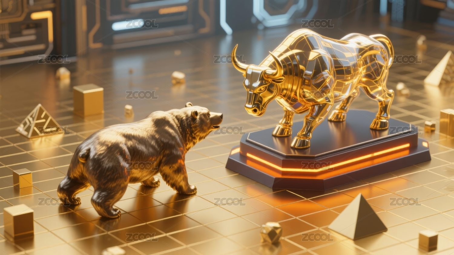 主视觉,商业,金牛,棕熊,科技,金融,场景,金色,几何,线条