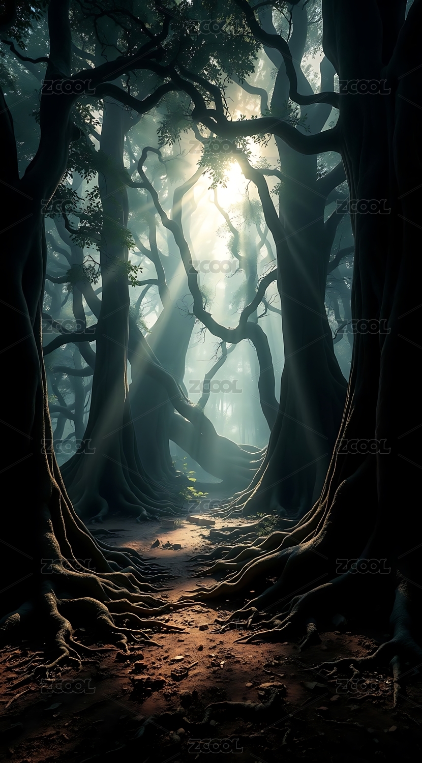 幽暗神秘的森林树影与光线