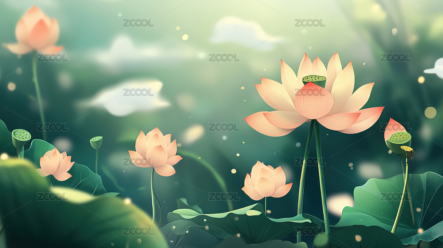 中国风荷花荷叶淡彩水墨插画壁纸背景