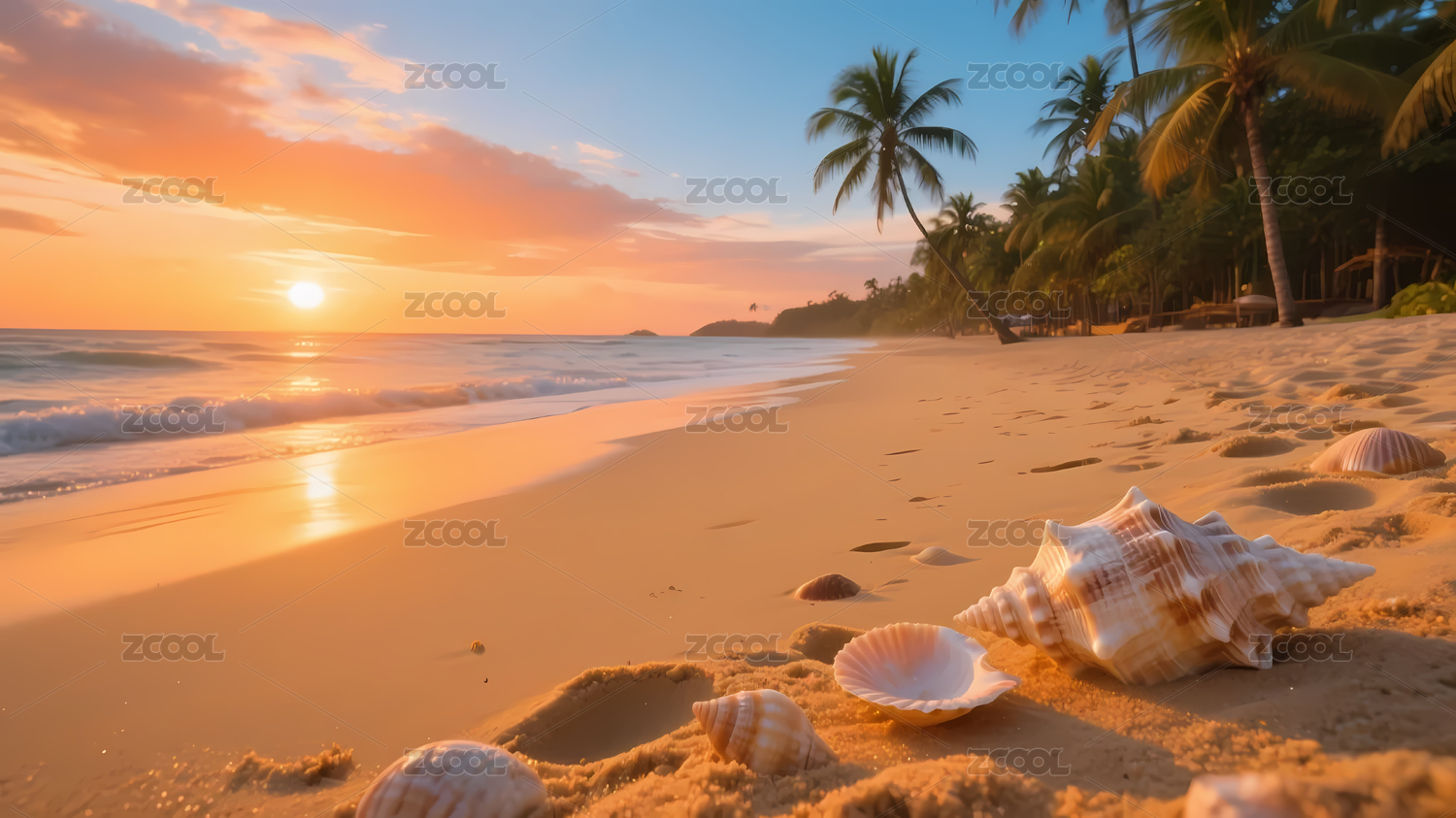 海滩贝壳夕阳棕榈树