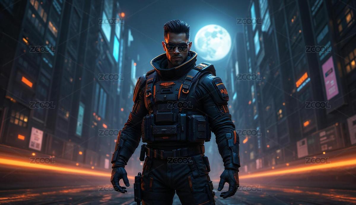 科技,虚拟现实,光影效果,未来战士,霓虹都市,科幻场景,夜景街道,明亮月亮,高科技装备,冷酷表情