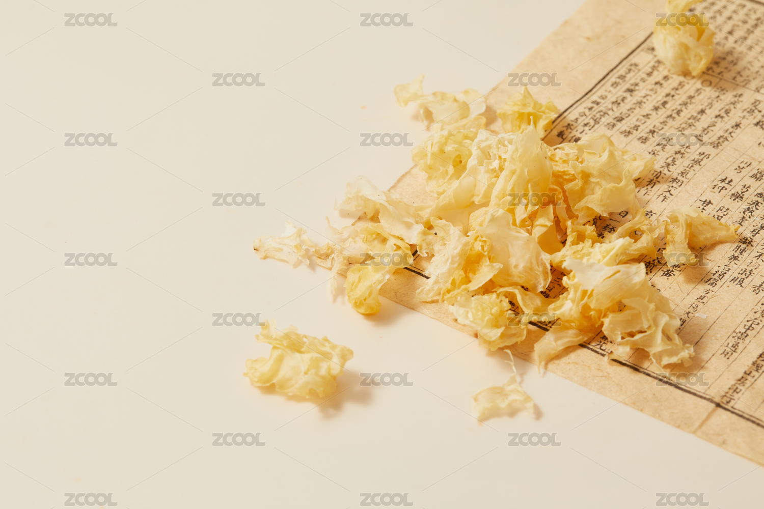 黄色背景古书上的中药材干银耳