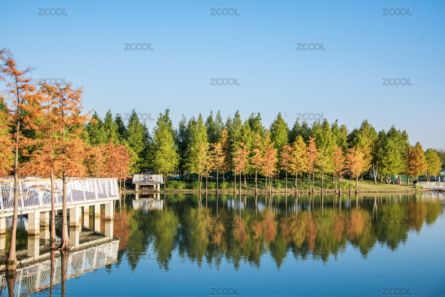 深秋虎丘湿地公园水杉树在湖面的倒影景色