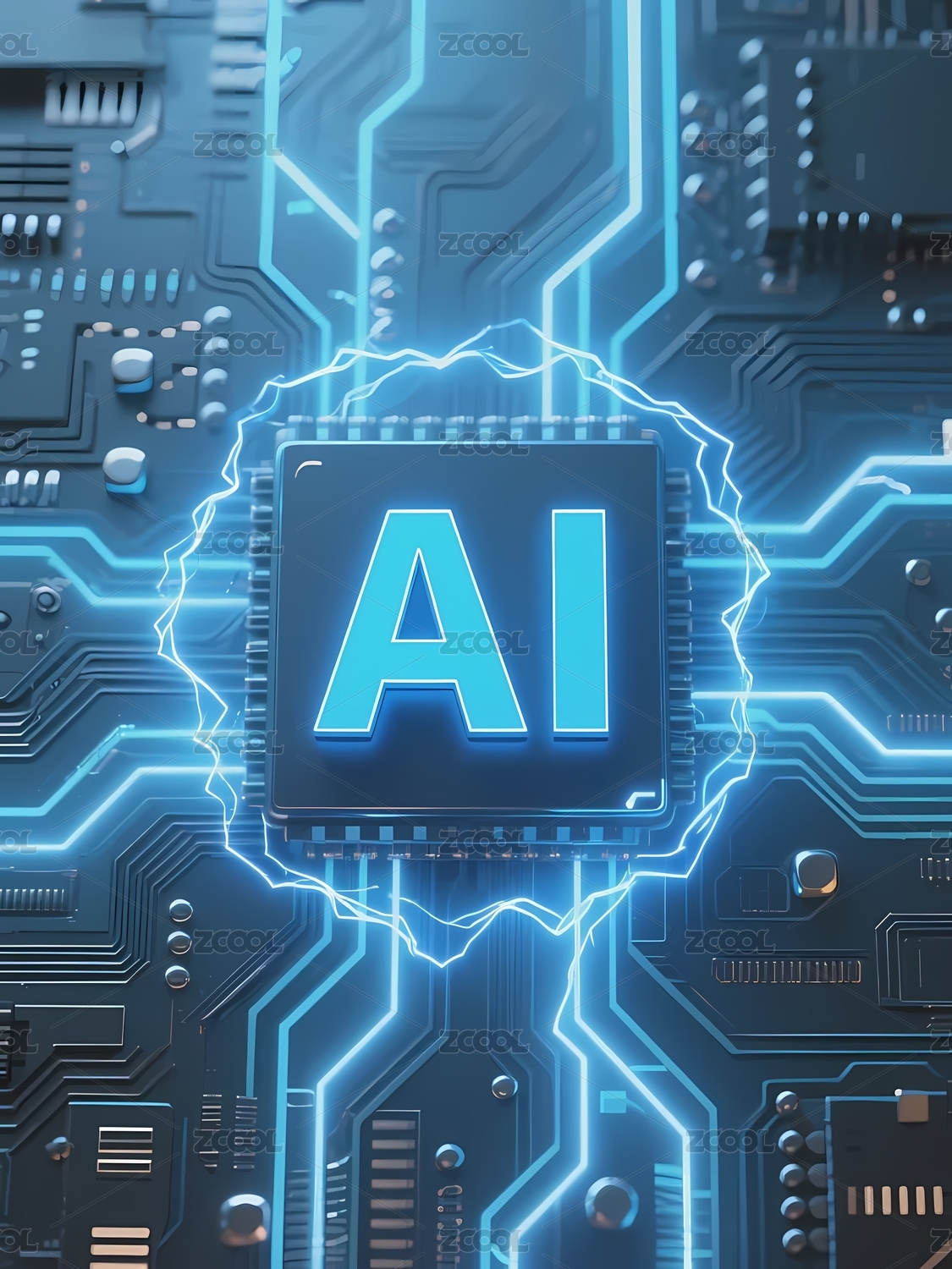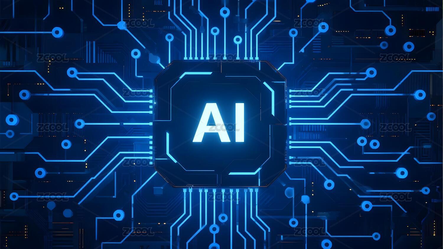蓝色电路板上的AI芯片图案