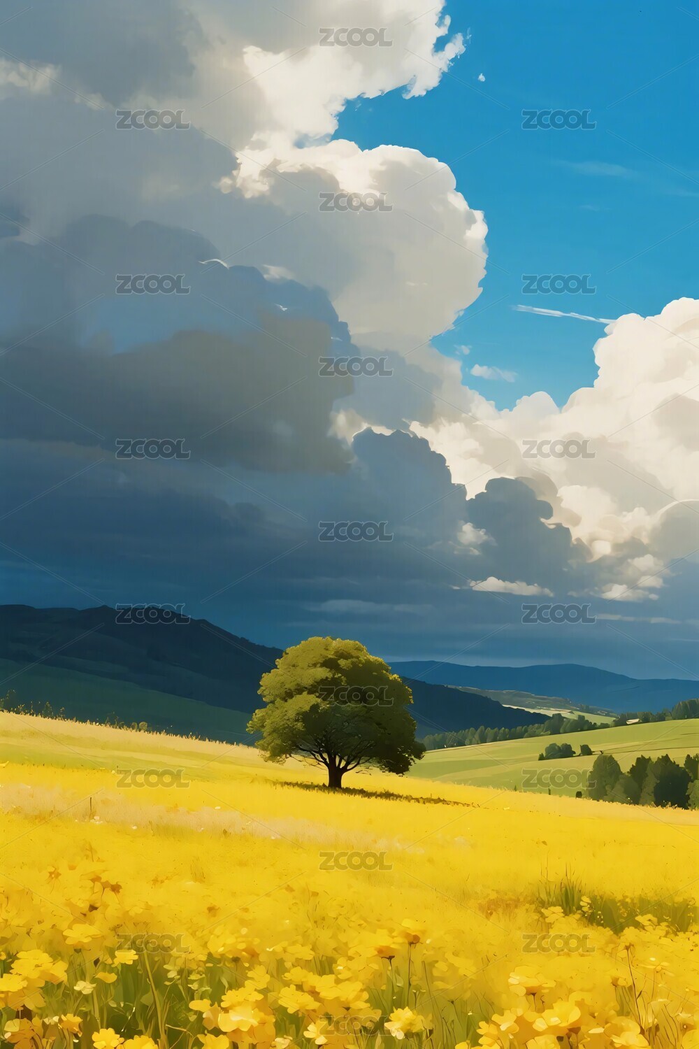 田园花田与孤树