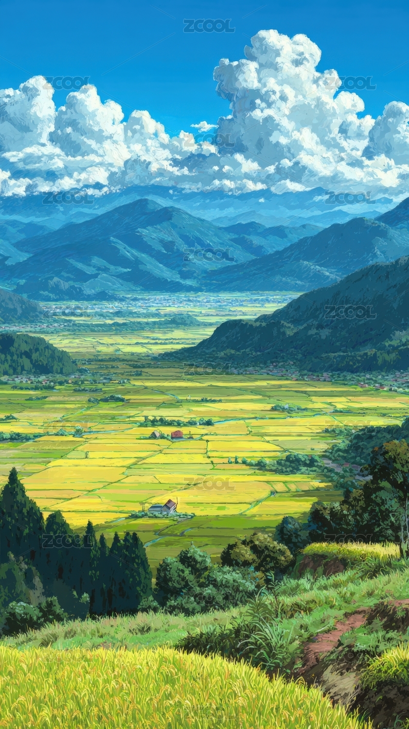 夏日山间田园风光插画