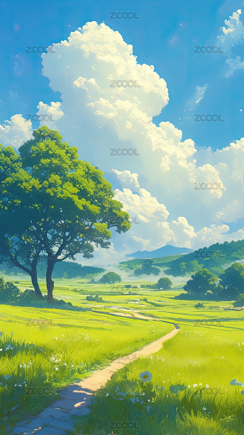 蓝天白云下的绿草田野
