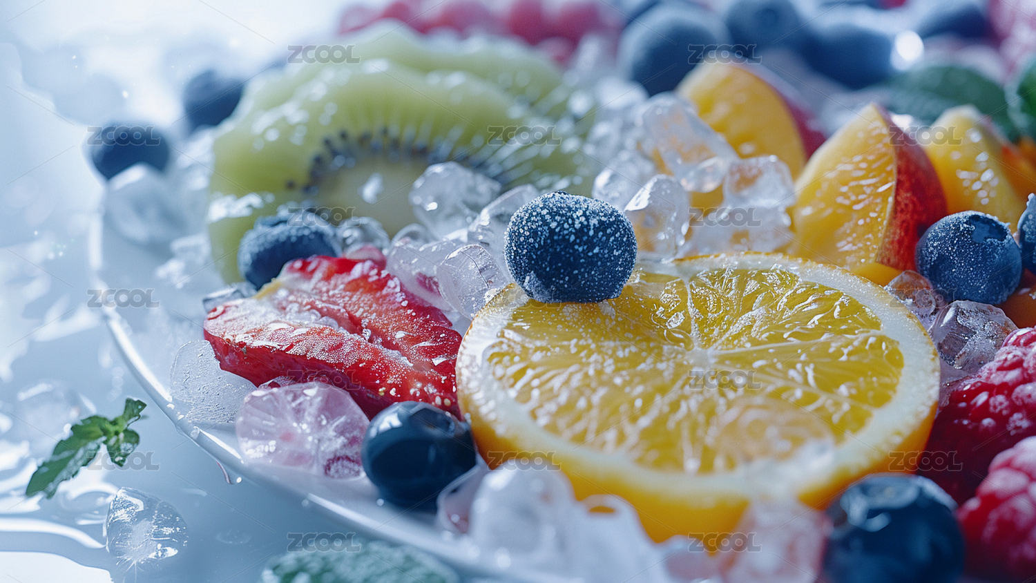 各种水果冻在冰块里