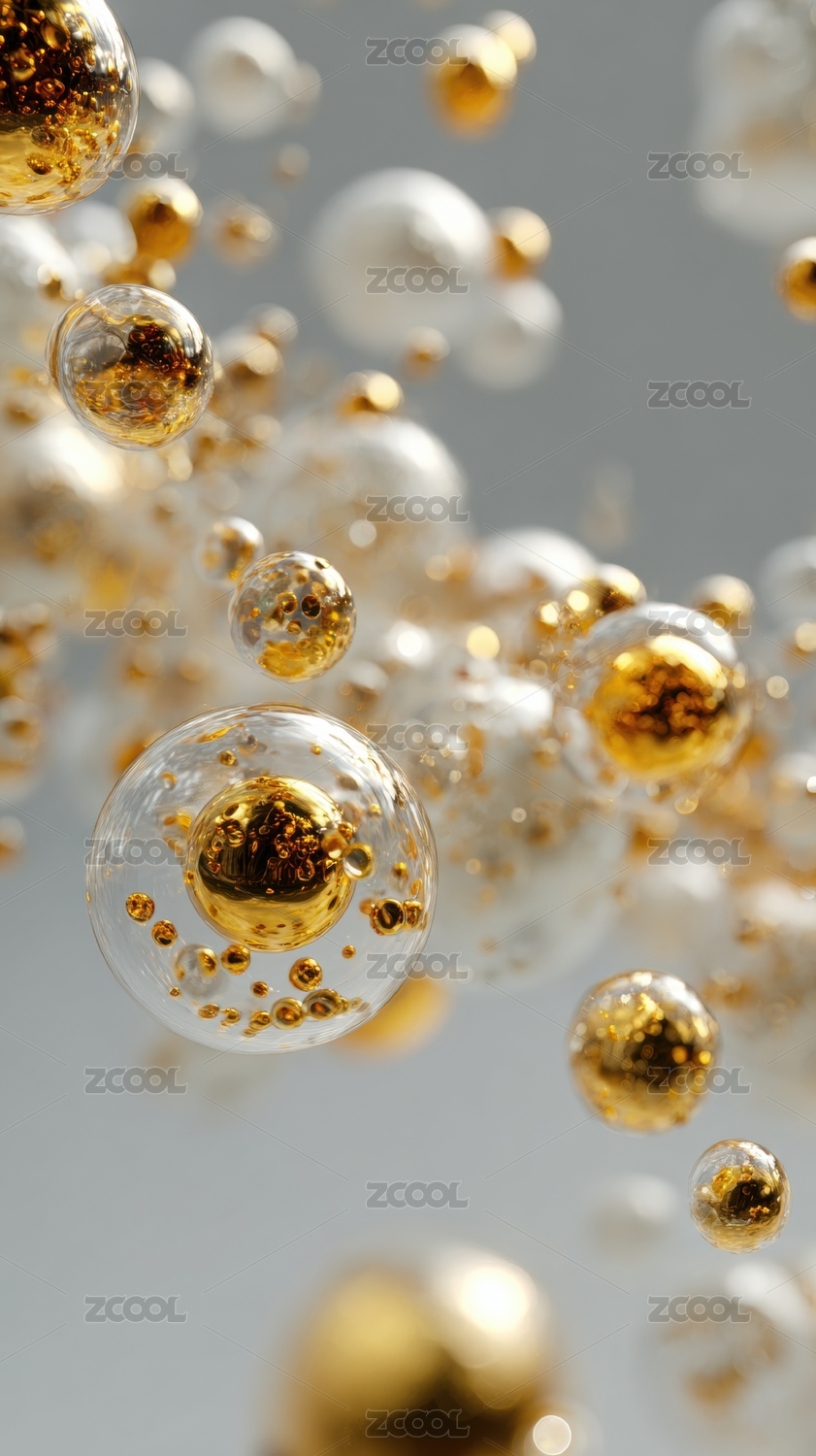 金色气泡悬浮于透明液体中