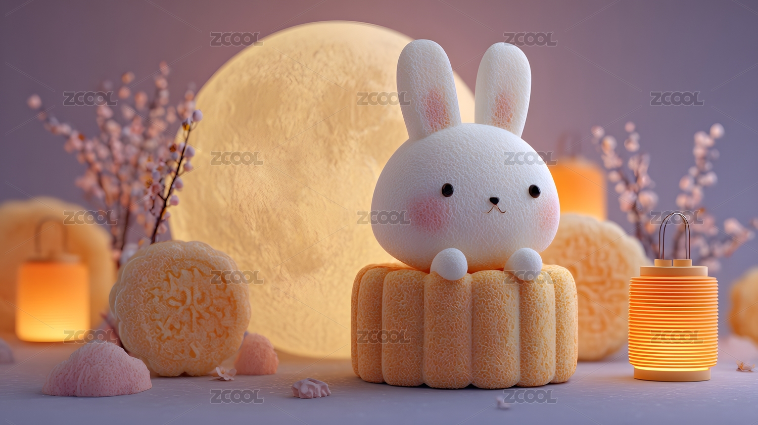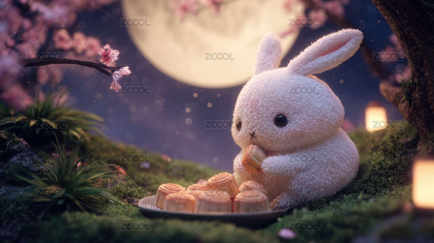 可爱玉兔赏月吃月饼 中秋节日喜庆场景