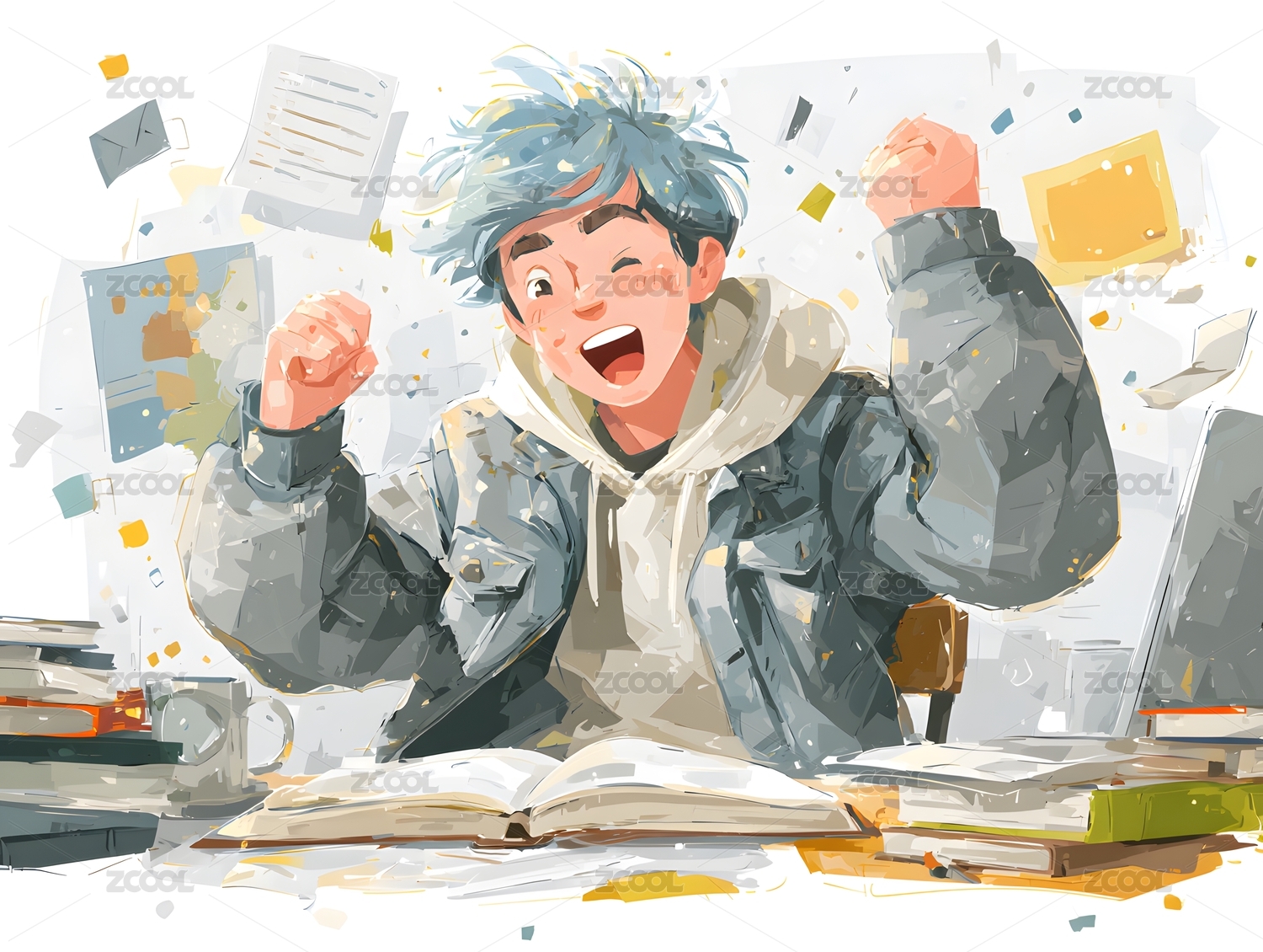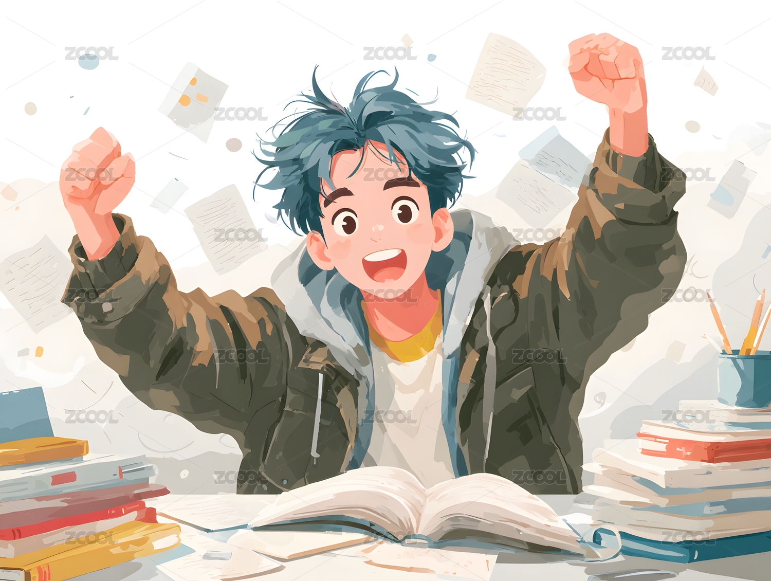 少年学习庆祝胜利 喜悦激动纸张纷飞
