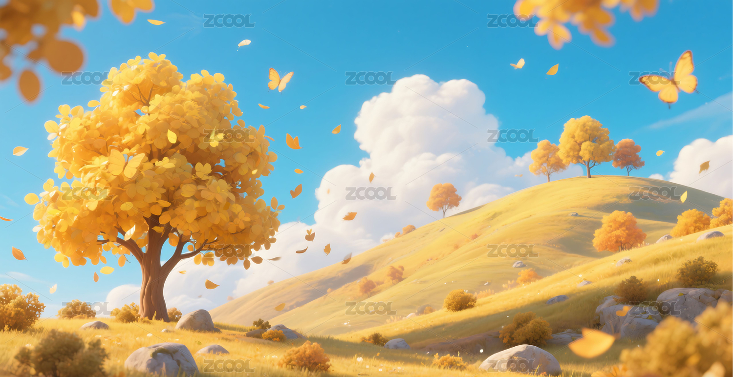 金黄,树木,蓝天,白云,雪山,黄叶,小溪,草地,秋天,山脉