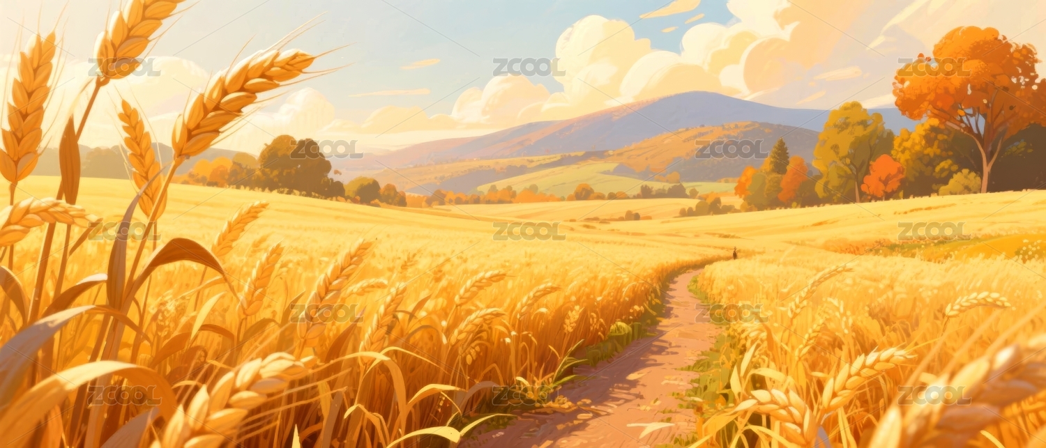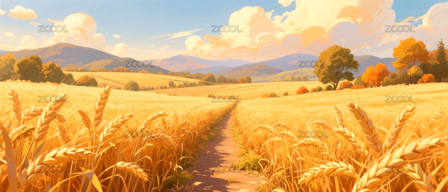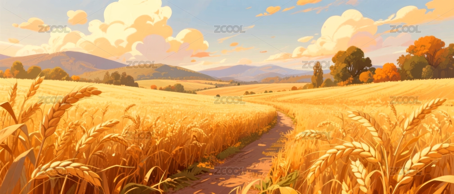 蓝天白云下金黄的麦田和大山背景童话风格插画