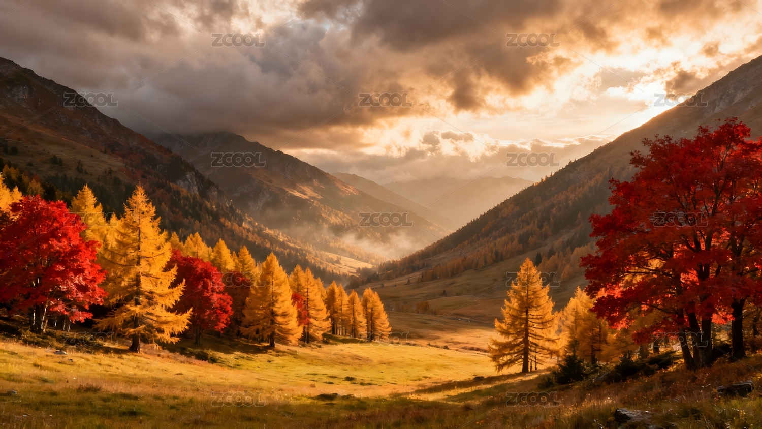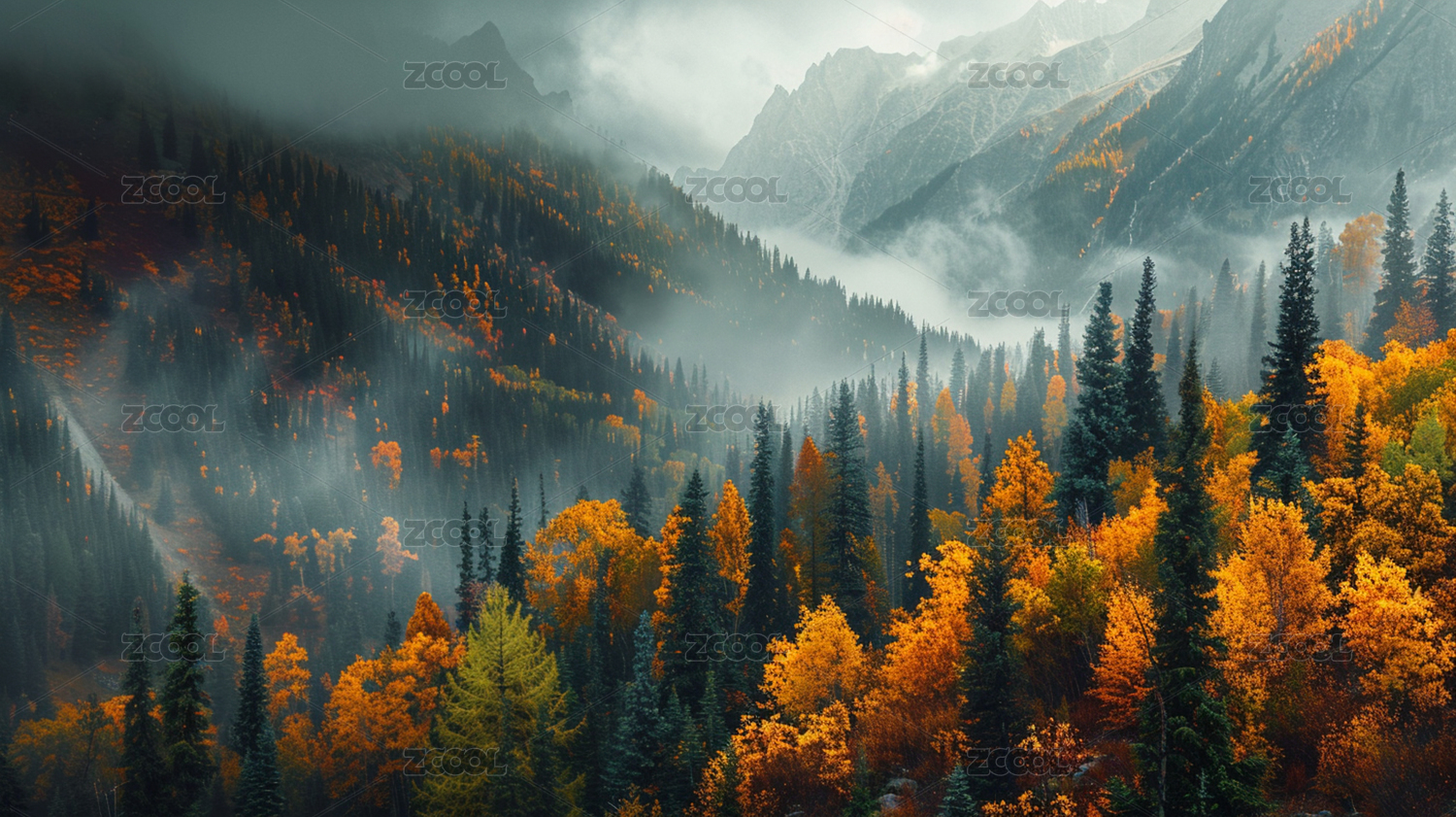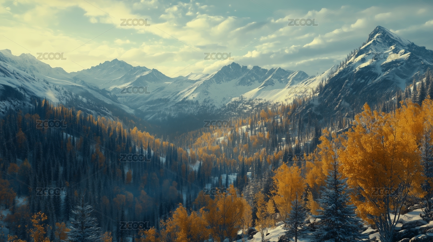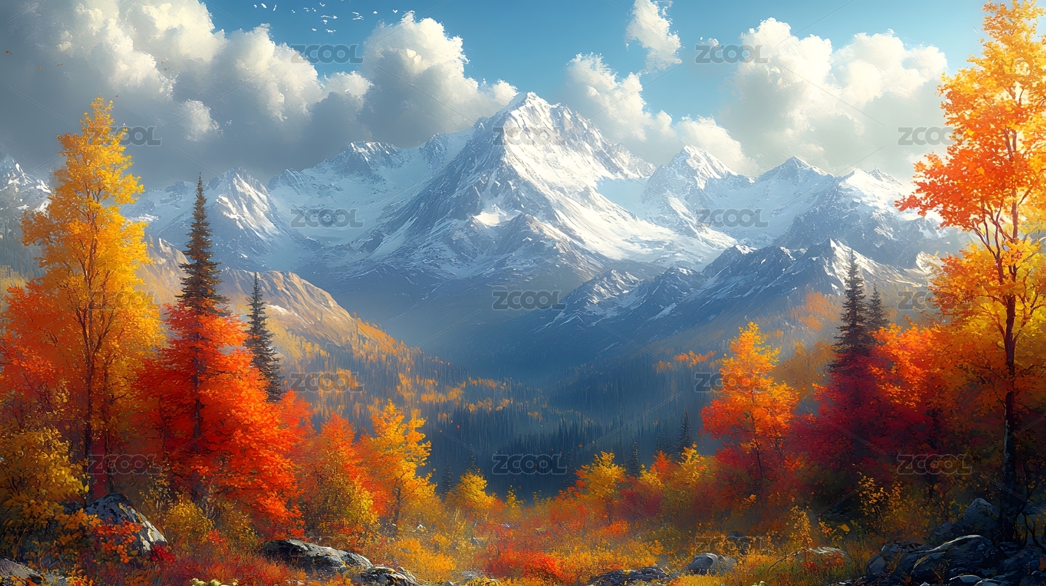 树木,森林,橙色,黄色,秋天,蓝天,白云,山脉,雪山,金红