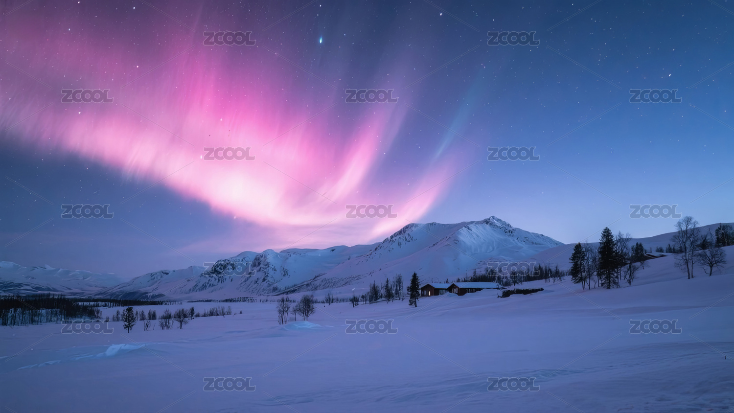 蓝色,背景,主体,粉色,夜空,轮廓,雪山,绚丽,远处,北极光