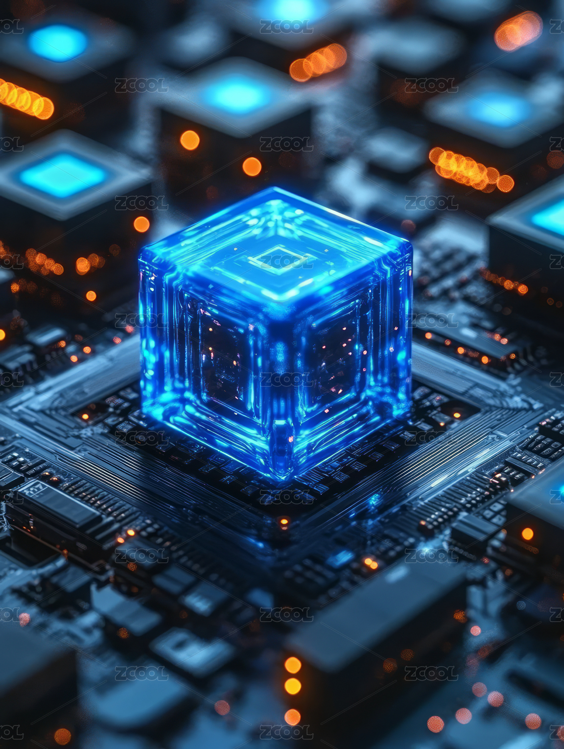 科技感电路板上蓝色发光智能立方体