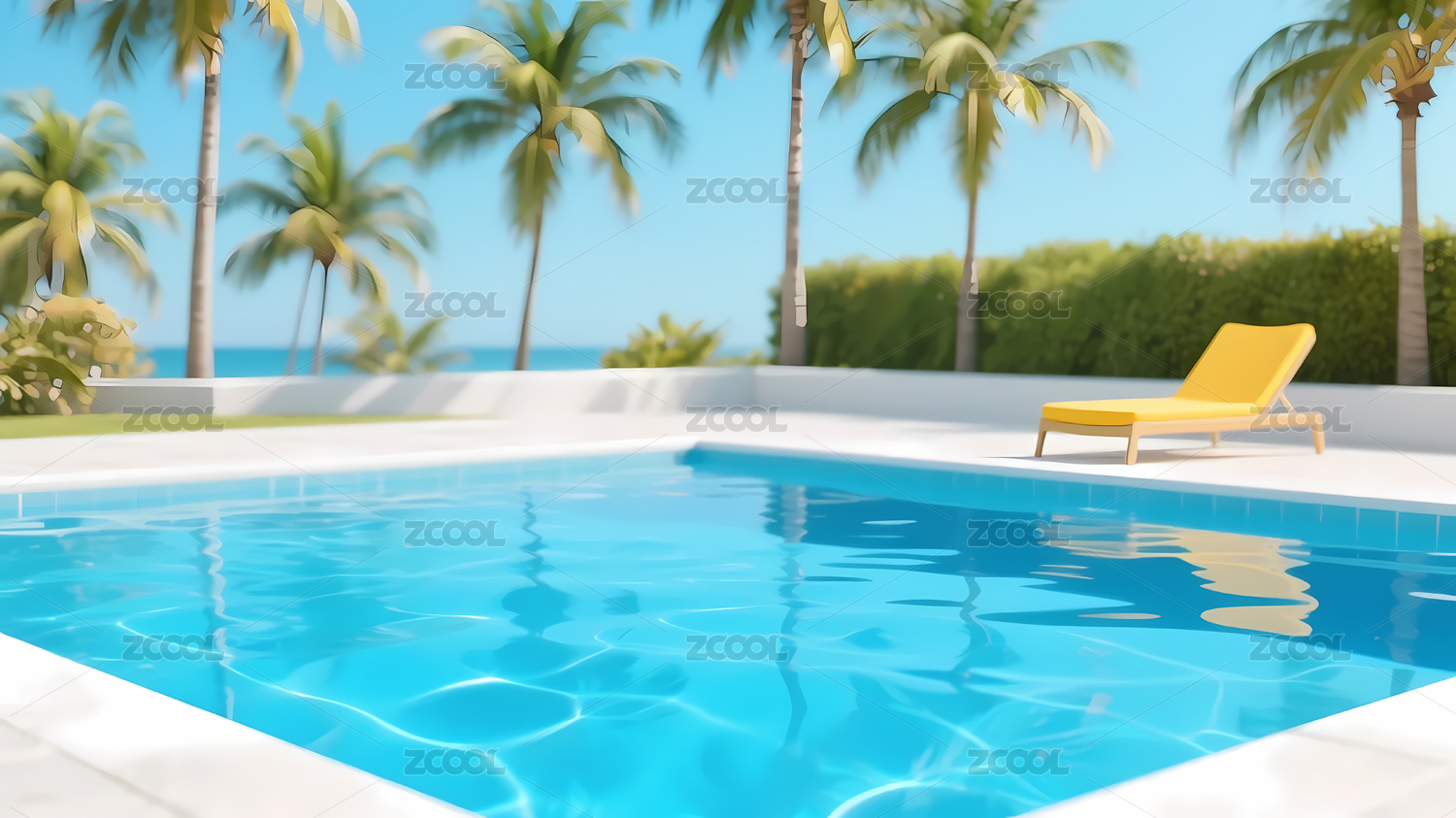夏天白天阳光下游泳池遮阳伞沙滩椅3D插画