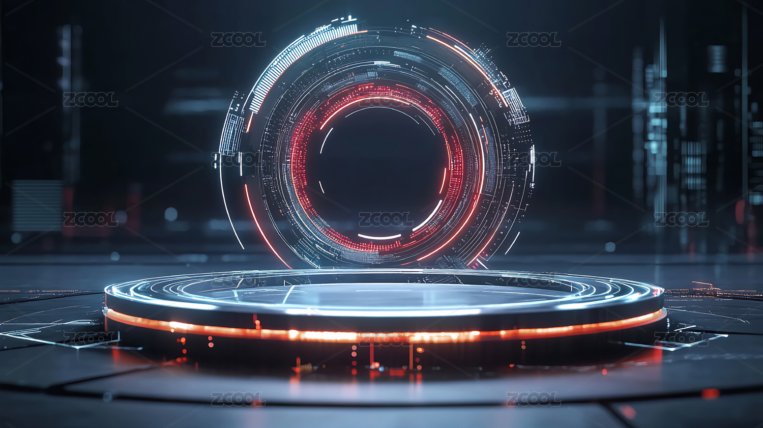 三维渲染蓝紫色霓虹灯拱门室内空间