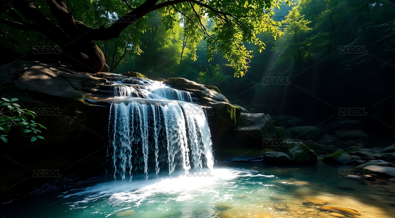 阳光照耀下的森林瀑布景观