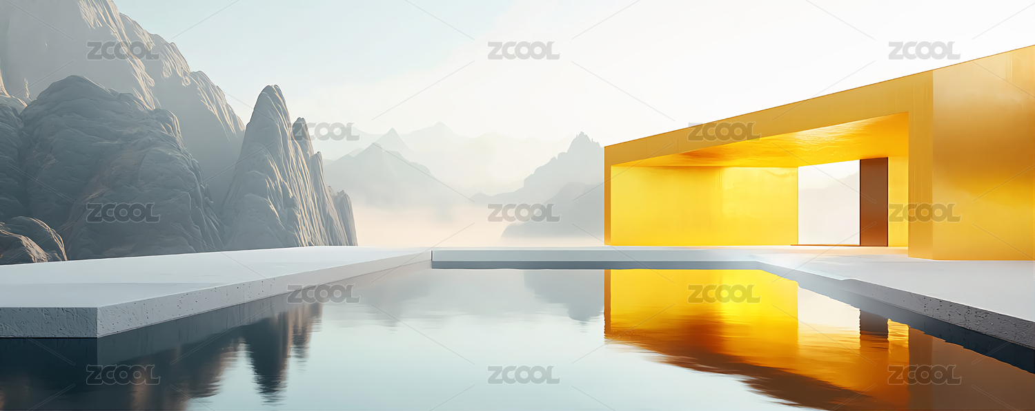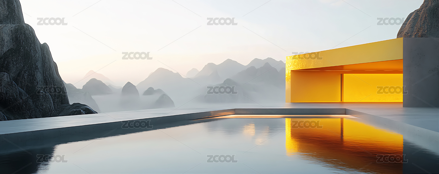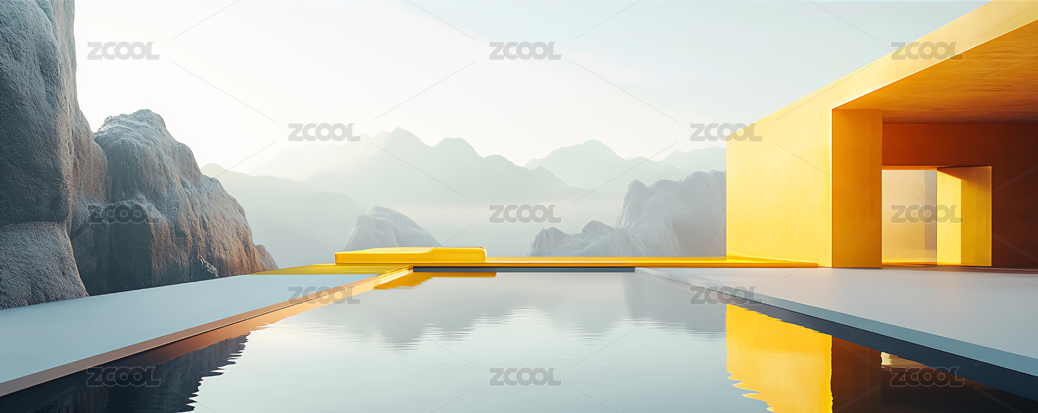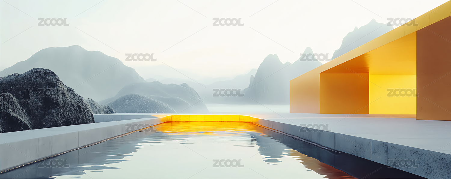 建筑,三维,场景,天空,地形,水,游泳池,背景,黄色,光影