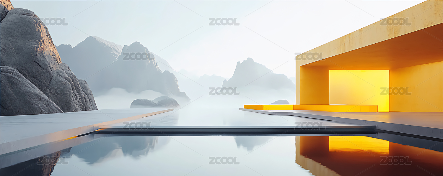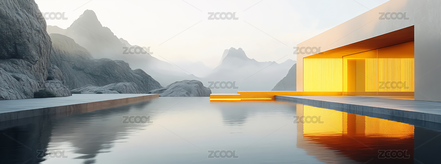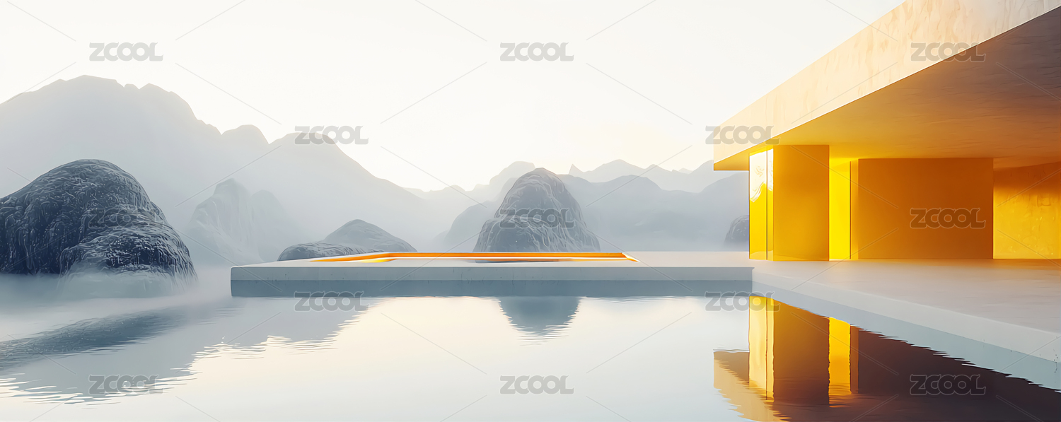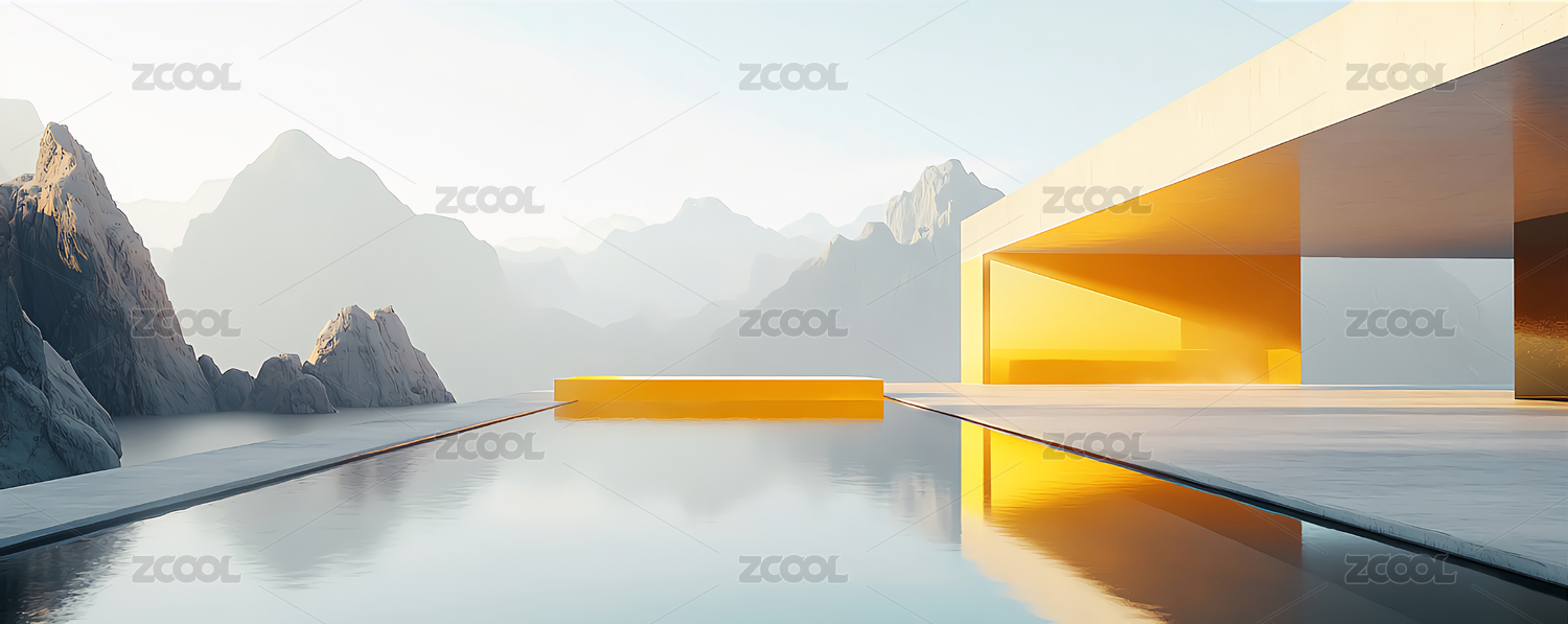建筑,三维,场景,天空,地形,水,游泳池,背景,黄色,光影