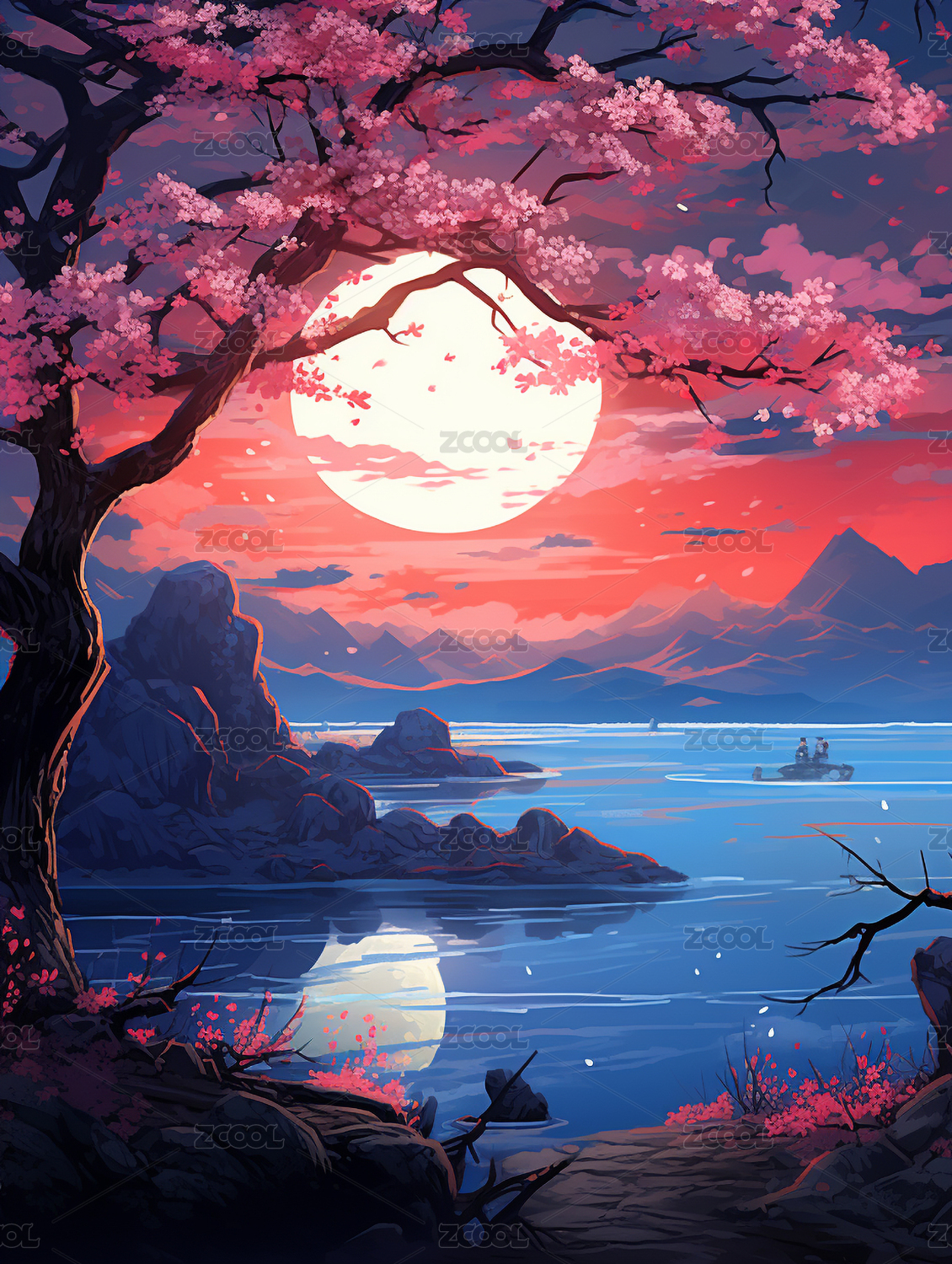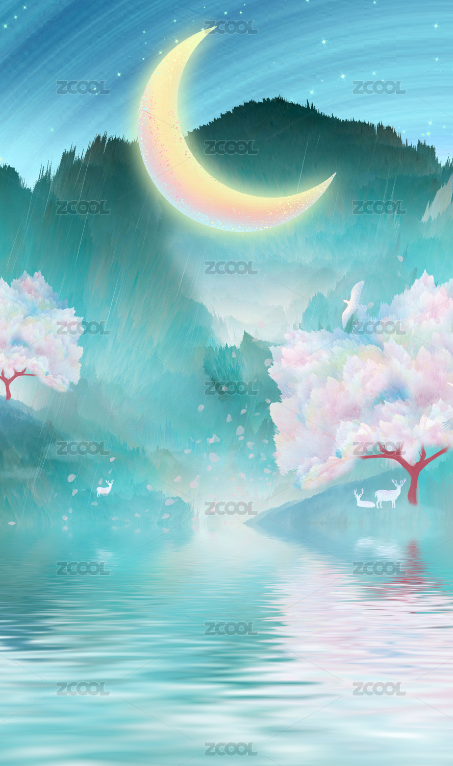 夏天星空下月亮遗落在小森林里,仙鹤在鲜花盛开的美丽仙境湖泊中畅游飞舞