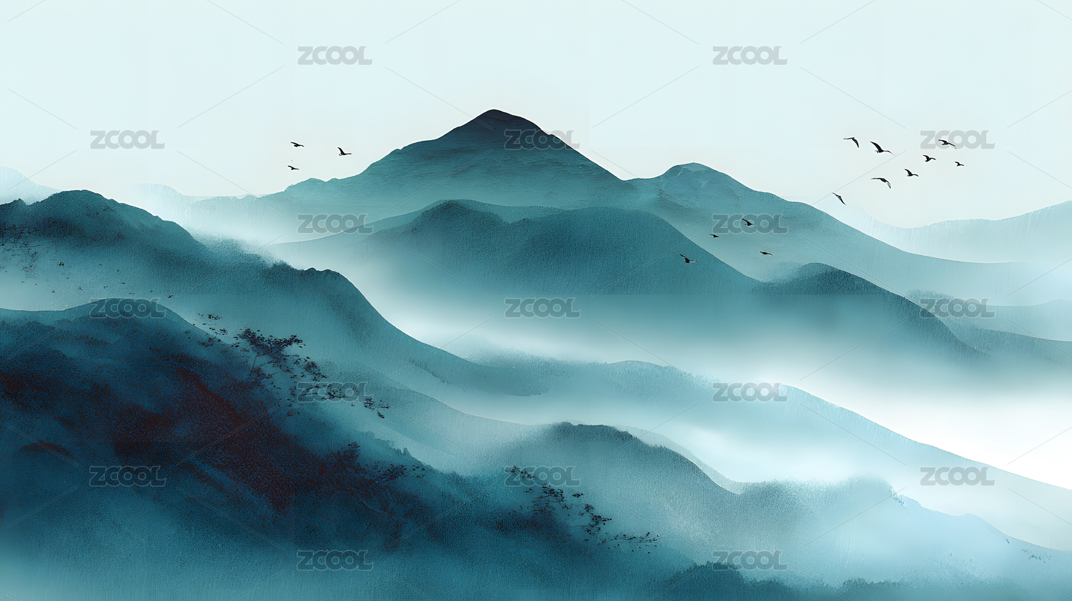 水墨画,千里江山,风景,背景,国画,国潮,高山,云雾,绿色,写意