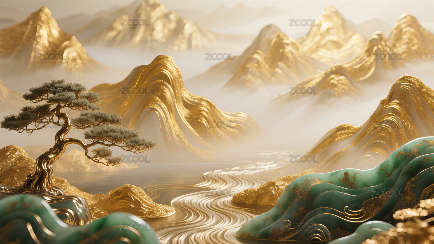 墨绿色,玉石,山脉,鎏金,河流,红色,松树,金色,商务,电商
